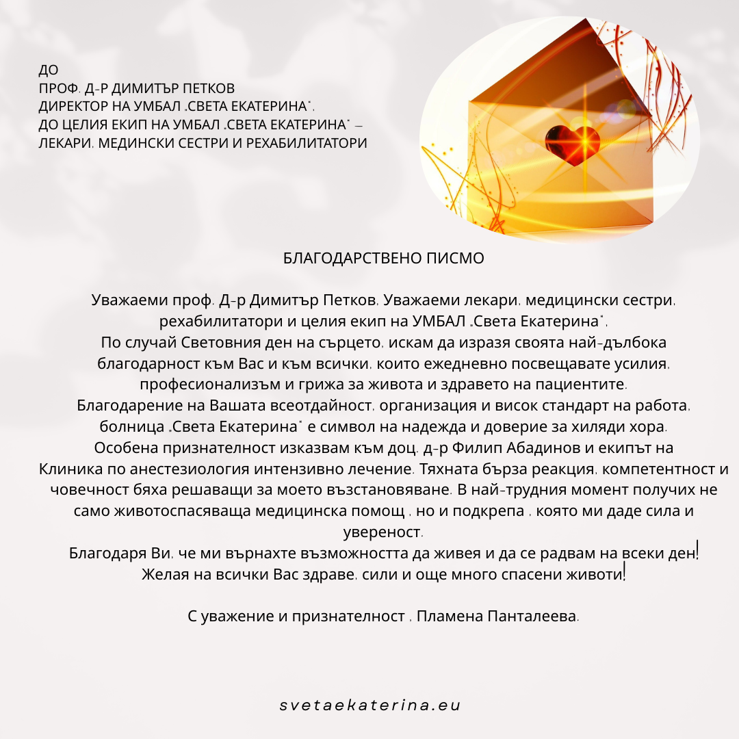 С радост споделяме още едно трогателно мнение от наш пациент – г-жа Пламена Панталеева, която по повод Световния ден на сърцето изпрати своето благодарствено писмо до проф. д-р Димитър Петков и целия екип на УМБАЛ „Света Екатерина“.
