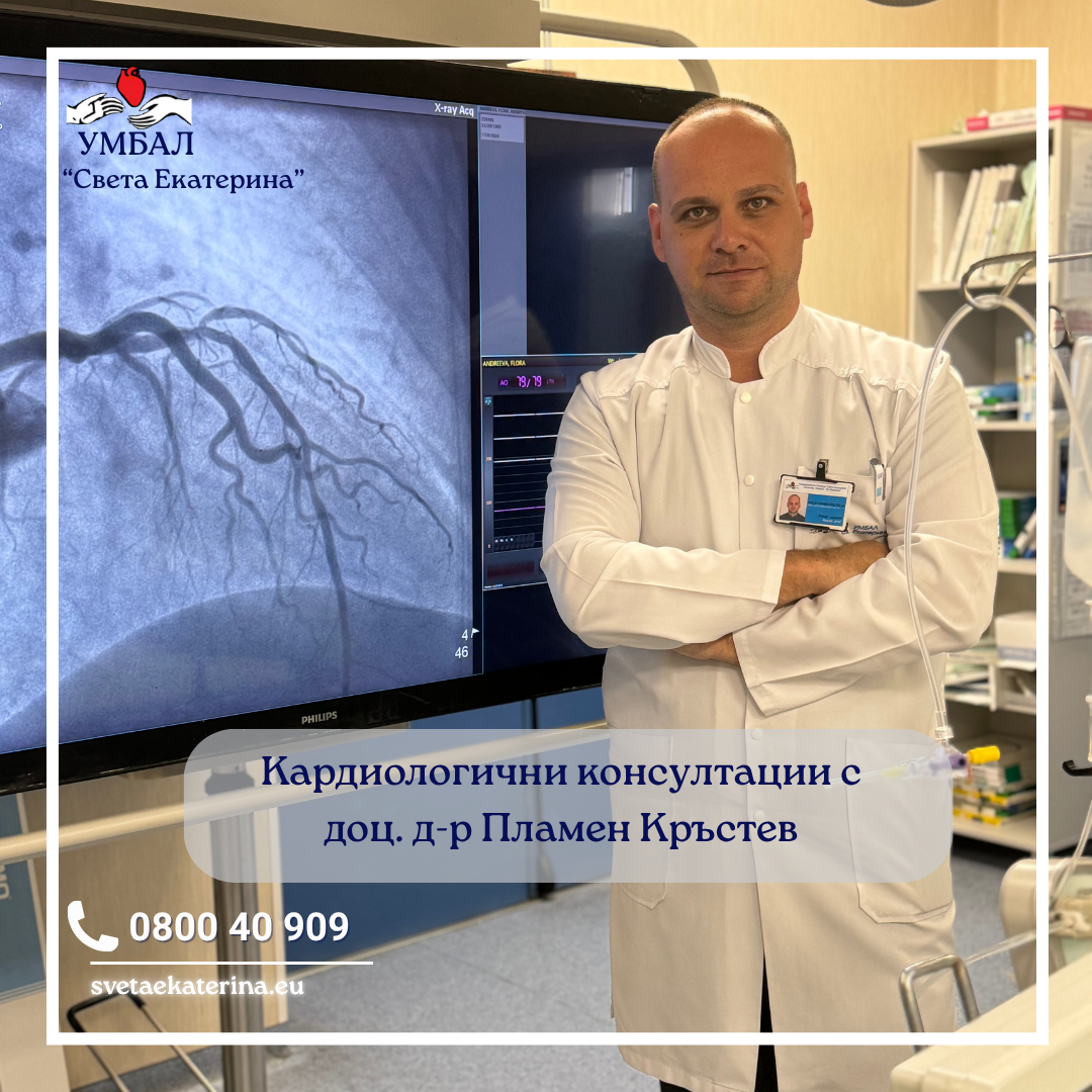 В дните от 13 до 16 октомври и от 27 до 30 октомври (понеделник – четвъртък) пациенти ще имат възможност да бъдат прегледани и консултирани от доц. д-р Пламен Кръстев, един от водещите специалисти по кардиология в УМБАЛ „Света Екатерина“.