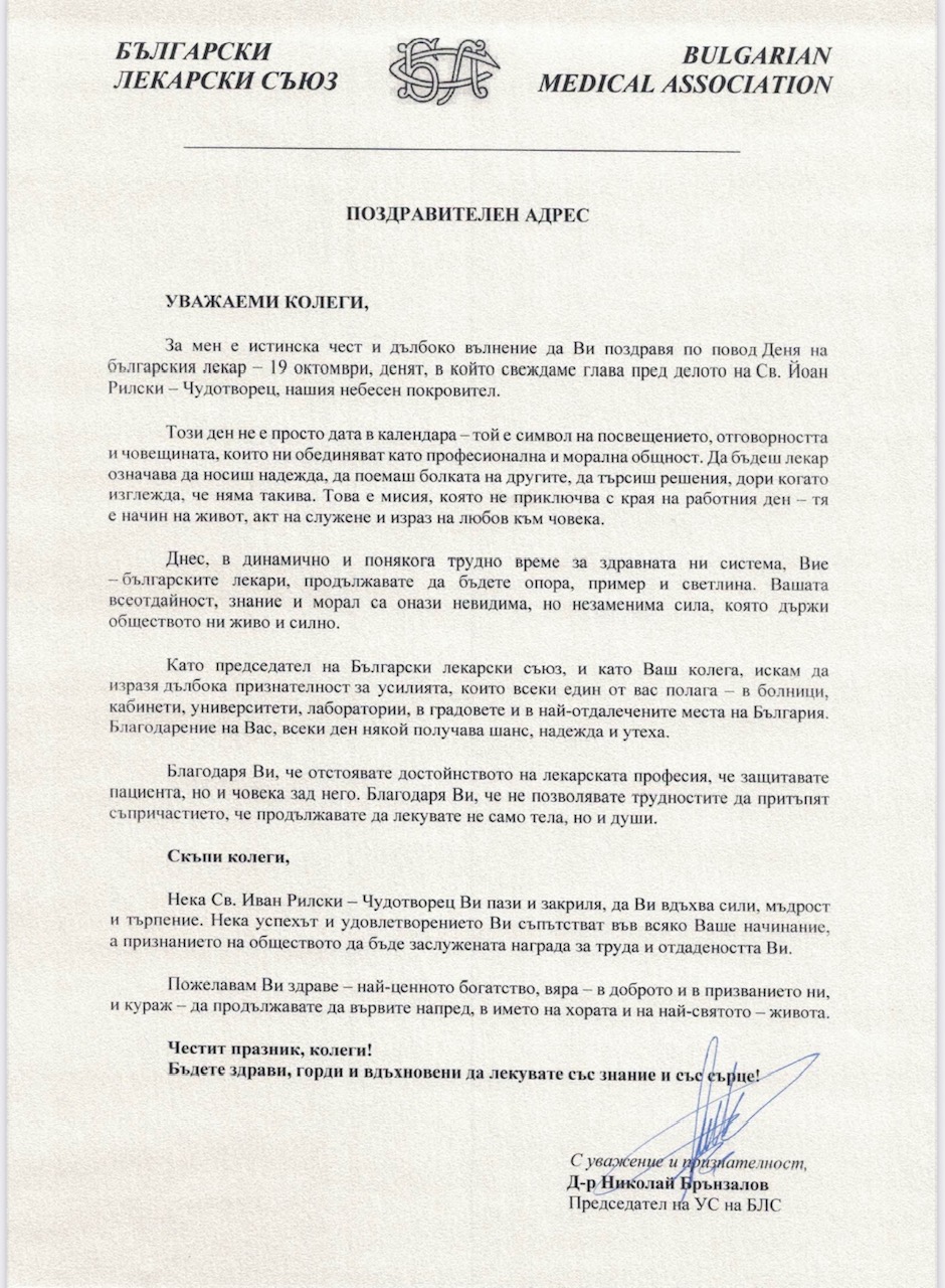 Щастливи сме да споделим, че УМБАЛ „Света Екатерина“ получи поздравителен адрес от Български лекарски съюз по случай 19 октомври – Деня на българския лекар.