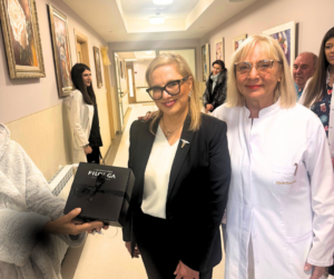 В навечерието на коледните празници пациентите на Клиниката по медицинска онкология в УМБАЛ „Света Екатерина“ получиха специални подаръци от дерматолога д-р Мария Тончева. Тя поднесе на лекуващите се и на медицинския екип празнични комплекти, включващи регенеративна козметика и хранителни добавки, създадени да подпомагат възстановяването и грижата за организма по време на онколечение.