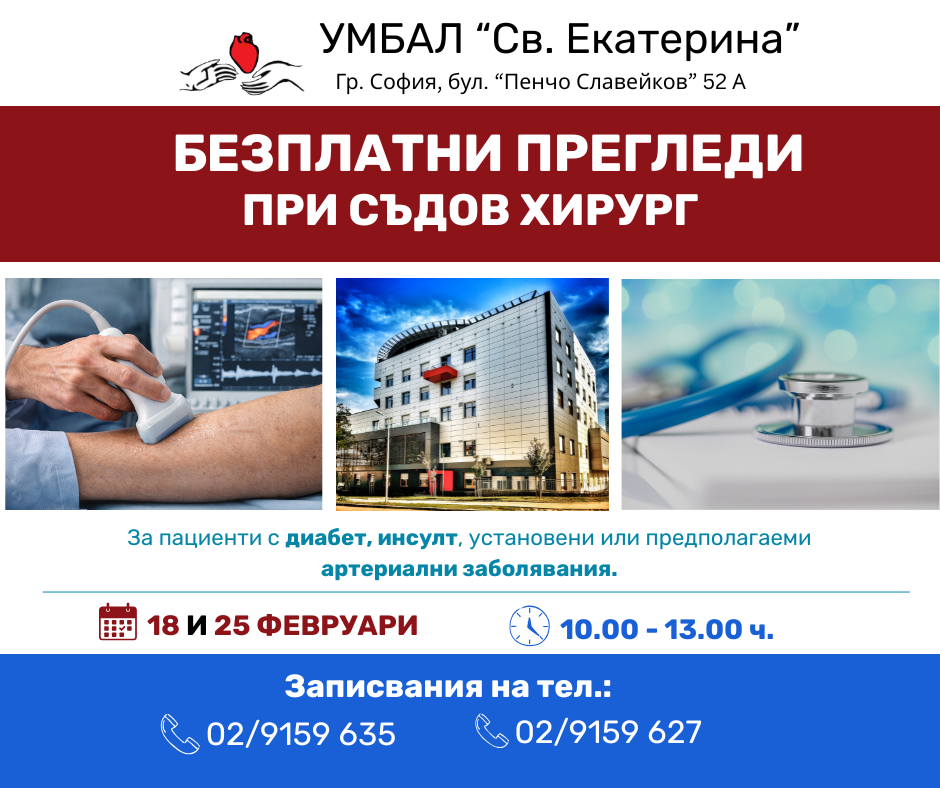 Клиниката по съдова и ендоваскуларна хирургия към УМБАЛ „Св. Екатерина“ организира безплатни прегледи при съдов хирург.